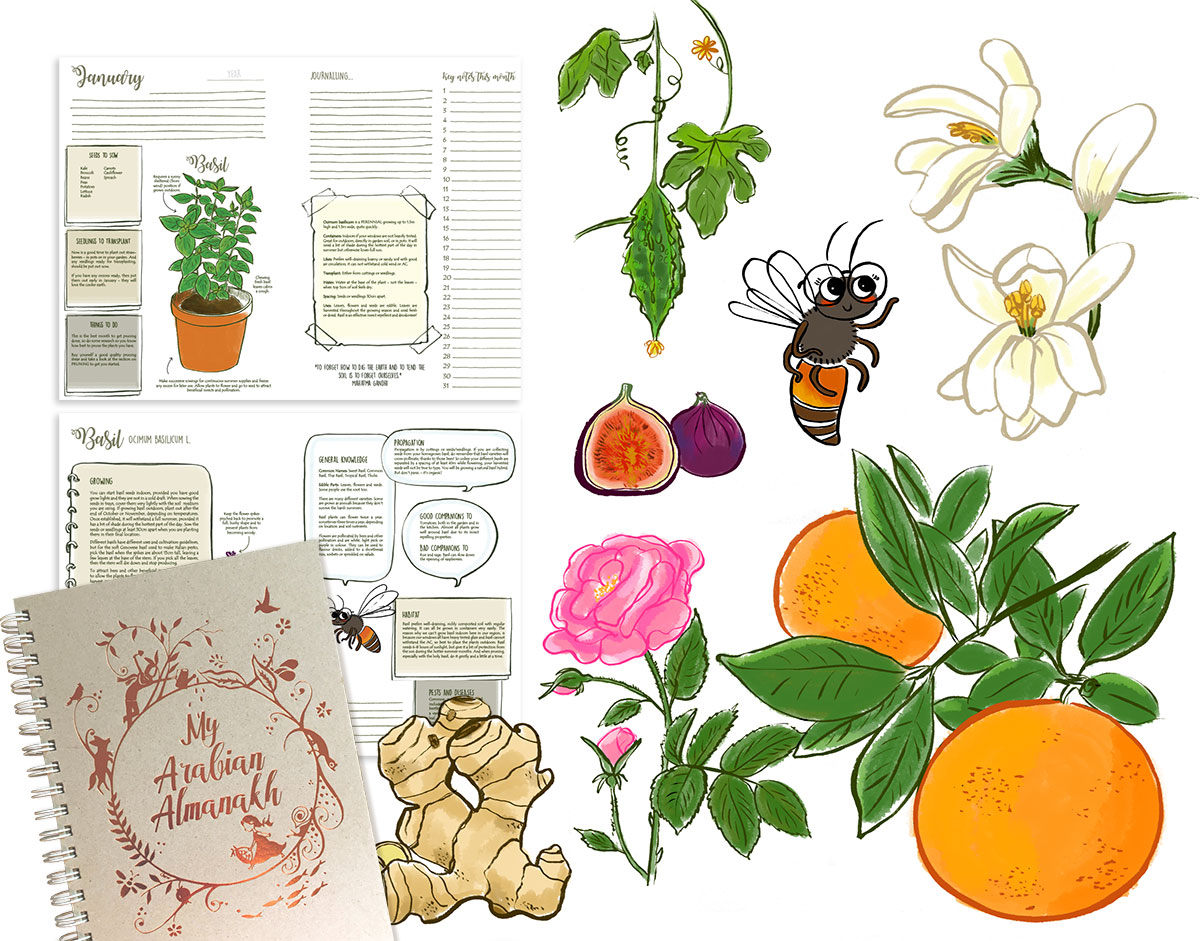 Illustration vignettes and book design for "My Arabian Almanakh". A gardening journal specific to the challenges of growing and nurturing plants in the Arabian peninsula - organic, holistic & pesticide-free! A self-published collaboration between four nature lovers. Buy your copy here. Cover artwork by Cherida Fernandez.